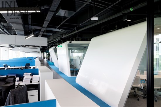 辦公樓層的中央部分在顏色和功能上是很靈活的。全玻璃墻對莫斯科具有全景的視角,接近于全景玻璃墻區(qū)域的工作站設(shè)計相對平靜一些,因為擺放的都是白色的桌子和黑色的椅子。桌子進行了非常舒服的安排,在每排中間都有足夠的空間來容納帶有座墊的移動文件柜,并可以組織內(nèi)部的協(xié)商。除了固定的工作場所,辦公室內(nèi)還有臨時工作場所,其配備了高高的桌子和人體工學的酒吧椅。設(shè)計師將很多關(guān)注都聚集到了聲學設(shè)計上面,包括屏風、隔音分區(qū)和吸聲板,其他的會議室采用了吸音材料。