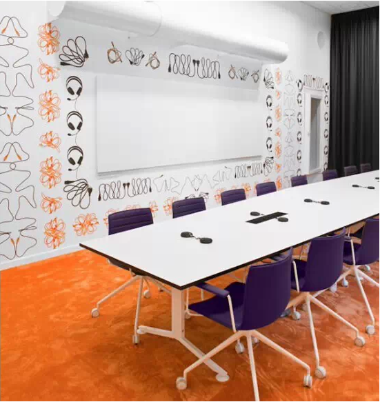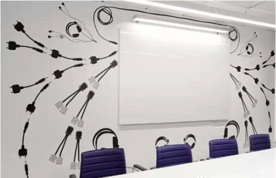 充滿繽紛的色彩和現(xiàn)代家具。在墻壁的白色背景下,用電線電纜、耳機(jī)等通訊設(shè)備制做了大型壁畫,充分