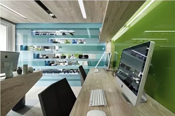 設(shè)計(jì)師在材料選擇上使用了木飾面、白色手掃漆、烤漆玻璃、木地板,辦公室設(shè)計(jì)色彩清新自然,很時(shí)尚的辦公空間規(guī)劃裝修。