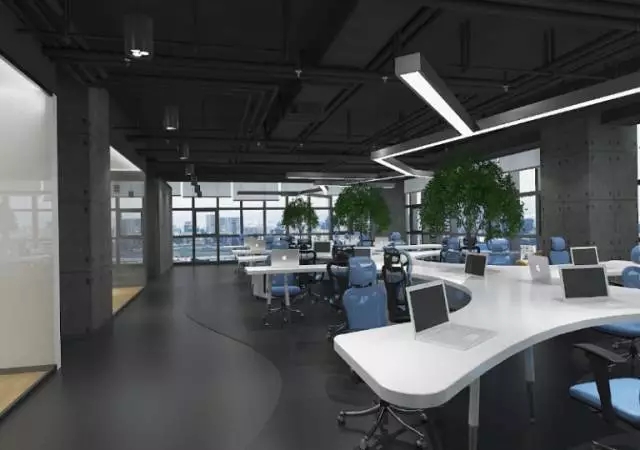 公共區(qū)域的辦公桌采用了一體化的設(shè)計(jì),形狀奇特,呈不規(guī)則幾何形,這也是后現(xiàn)代風(fēng)格的突出表現(xiàn)之一。淡藍(lán)色的椅子看起來(lái)賞心悅目,能夠起到鎮(zhèn)定的作用。值得一提的是,天花板上方的燈也是不規(guī)則幾何形,不僅與辦公桌的形狀遙相呼應(yīng),更給人以濃濃的科技感。