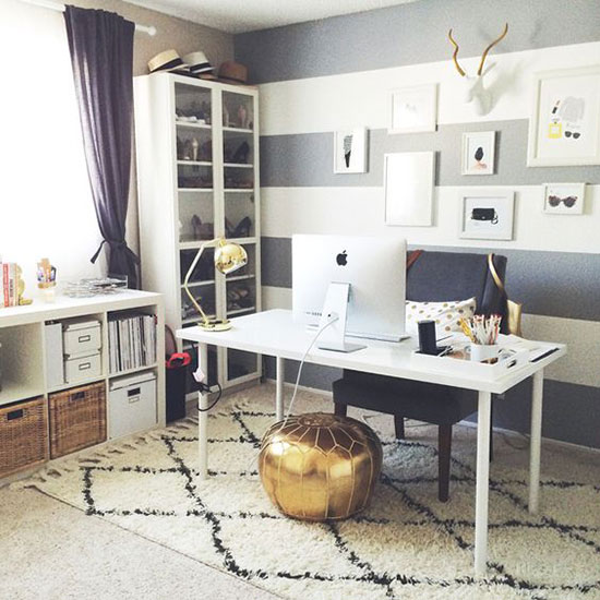 桌面不一定要靠墻,讓座椅背靠墻面,反而更有安全感與踏實(shí)感。背景墻的設(shè)計(jì)可以肆意發(fā)揮,黑白條紋壁紙加上裝飾畫(huà)組合,足以體現(xiàn)個(gè)性。