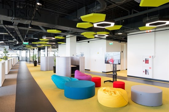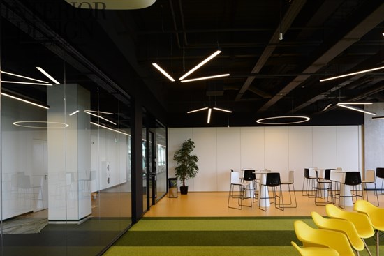 建筑師還試圖尋找公司專注的積極的生活方式和對運動的熱愛。比如,這產(chǎn)生了滑板車的設(shè)計想法:每個樓層都有軌道和停車場,任何人都可以在辦公區(qū)使用滑板車。同時也觸發(fā)了照明形式的設(shè)想——一個傳統(tǒng)的足球模式。辦公室大部分分區(qū)都是透明的,空白的墻壁上裝飾著阿迪達斯的圖形和激勵的話語。