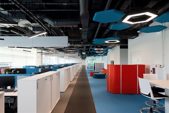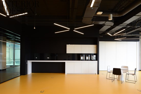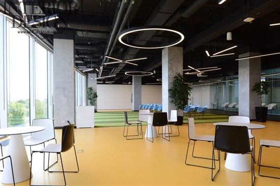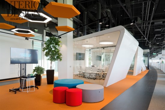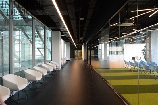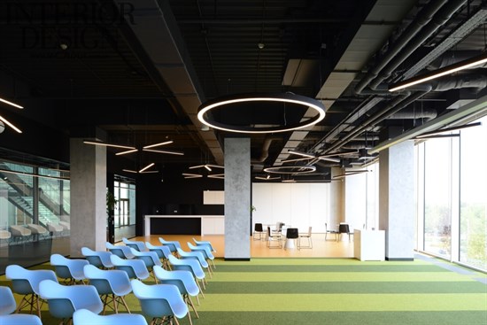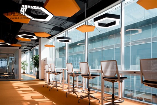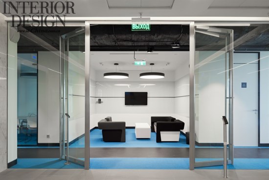 辦公樓層的中央部分在顏色和功能上是很靈活的。全玻璃墻對莫斯科具有全景的視角,接近于全景玻璃墻區(qū)域的工作站設(shè)計相對平靜一些,因為擺放的都是白色的桌子和黑色的椅子。桌子進行了非常舒服的安排,在每排中間都有足夠的空間來容納帶有座墊的移動文件柜,并可以組織內(nèi)部的協(xié)商。除了固定的工作場所,辦公室內(nèi)還有臨時工作場所,其配備了高高的桌子和人體工學的酒吧椅。設(shè)計師將很多關(guān)注都聚集到了聲學設(shè)計上面,包括屏風、隔音分區(qū)和吸聲板,其他的會議室采用了吸音材料。